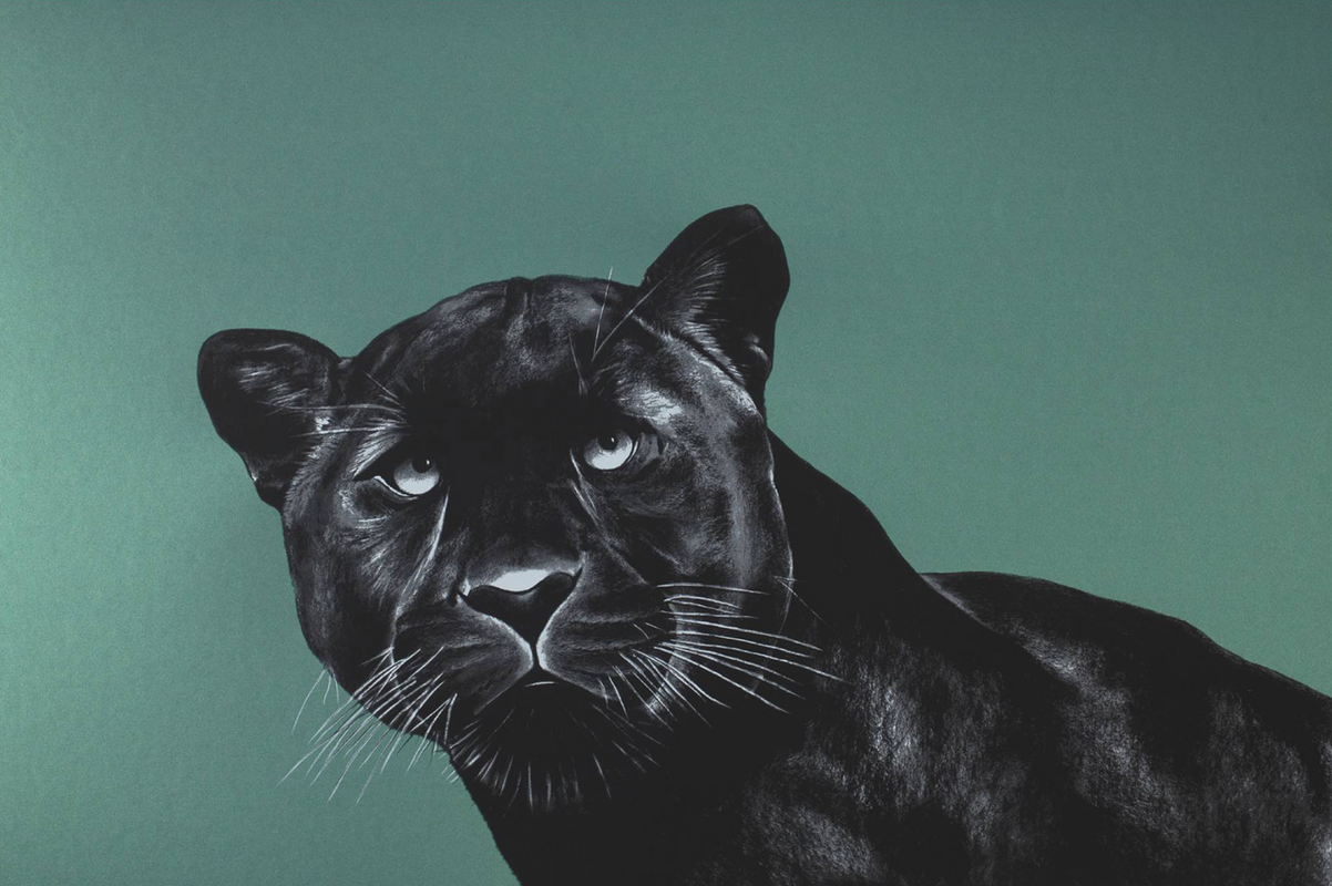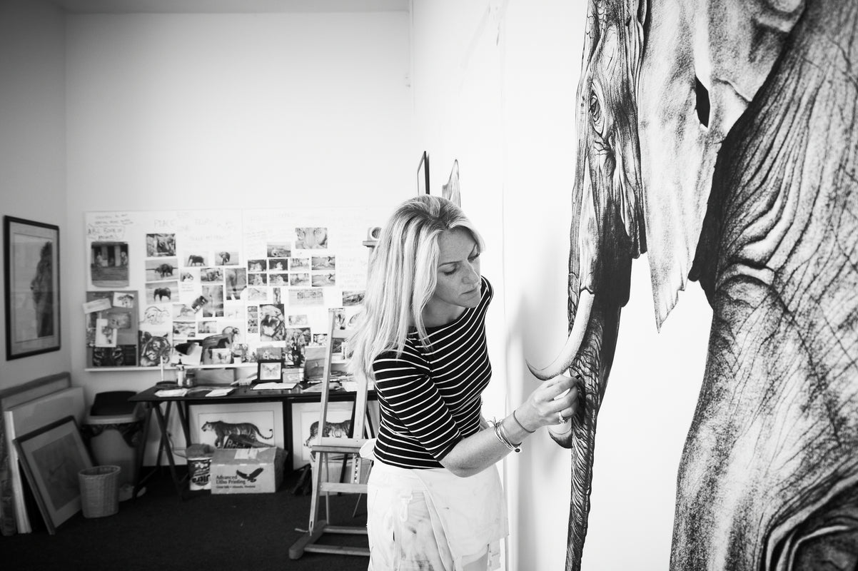 Like her great predecessors in the depiction of animals, such as Rembrandt Bugatti, Antione-Louis Barye or George Stubbs, she seeks to convey movement and the potential for movement as well as the 'fearful symmetry' of her beasts and the very large scale of many of her drawings adds a further powerful Dimension to the work.